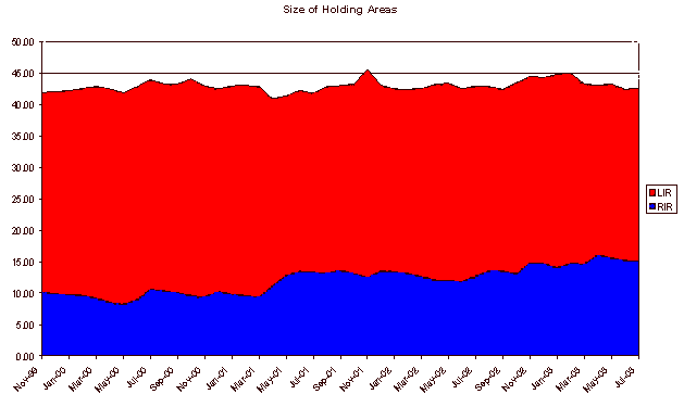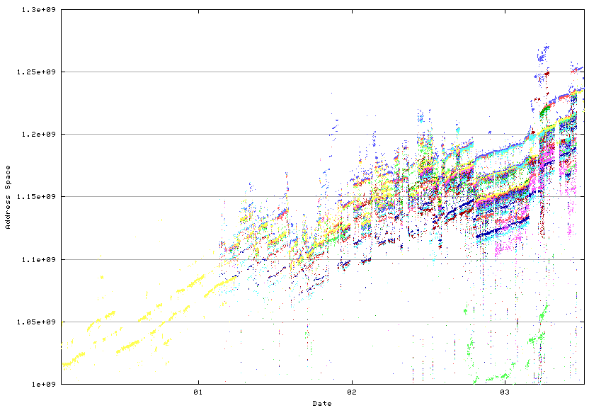 3. The amount of address space held by the RIR's grows slowly over time. There is a shorter period of oscillation imposed upon this pool, as each RIR will receive a /8 allocation from IANA when its existing managed pool is assigned beyond a set threshold (currently 80% assigned), and this additional allocated space is then assigned to the same level before a new IANA allocation is made to the RIR. The rationale for the gradual increase in the pool size again lies in the slowly increasing assignation inefficiencies associated with managing increasingly larger address pools.