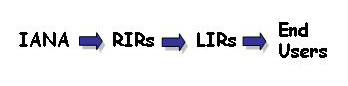 There are three stages in address allocation. The pool of IP addresses is managed by the Internet Assigned Numbers Authority, IANA. Blocks of addresses are allocated to Regional Internet Registries, who in turn allocate smaller blocks to Local Internet Registries (LIRs) or ISPs.
