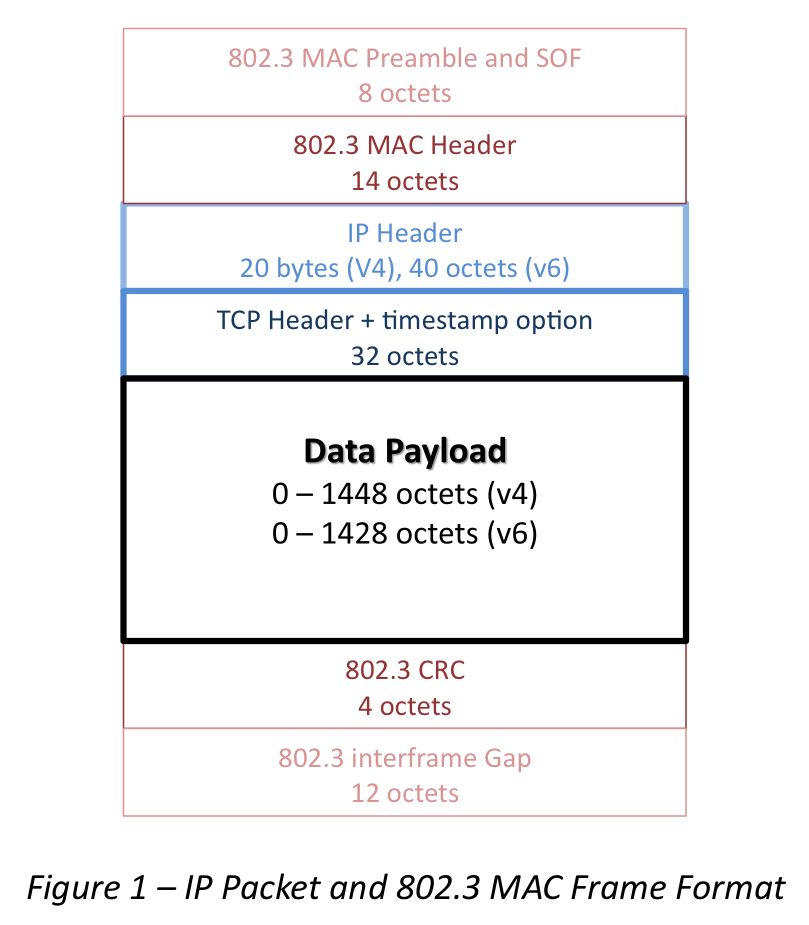 The first, and perhaps the most obvious difference in MTU settings is the different relative amount of overhead from the packet and frame headers. For a TCP stream operating with the timestamp option set (which appears to be a typical setting for Apache web servers) the overhead is 20 octets of IPv4 header, or 40 octets of IPv6 header, 20 octets of TCP header and 12 octets of timestamp TCP option header, or a total of 52 or 72 octets. If an 802.3 Ethernet frame is being used there is a further framing overhead of 8 octets of preamble and start of frame delimiter, 12 octets of MAC addresses, 2 octets of Ethertype, and a trailing frame overhead of 4 octets of the CRC value and 12 octets of the interframe gap (Figure 1).