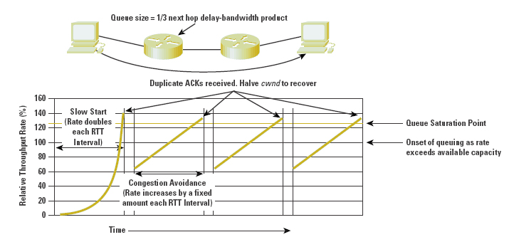 The general characteristics of TCP rate control is shown in the following figure. TCP initially starts in a mode termed "Slow Start", and then may either stabilize at a resource-limited sending rate, or use a dynamic rate control algorithm termed "congestion avoidance".