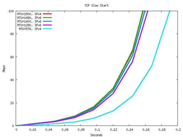 It will take 0.192 seconds for an IPv4 connection using a 576 byte MTU to reach the bottleneck capacity of 100Mbps. It will 0.168 seconds, or 7 RTT intervals, for an IPv6 connection sized anywhere between 1280 octets and 1500 octets MTU. The range of time from the smallest MTU to the very common 1500 MTU in this example is just 7/100's of a second.