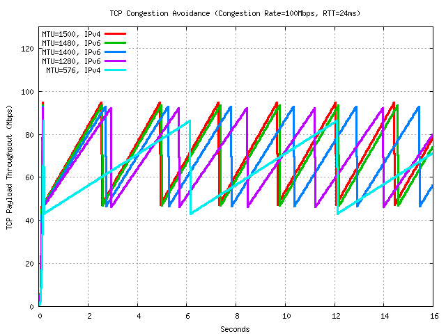 In this case the rate acceleration of an IPv6 TCP session in congestion avoidance mode, using an MTU of 1280 and an RTT of 24ms is some 16% slower than an IPv4 session using an MTU of 1500 over the same path.