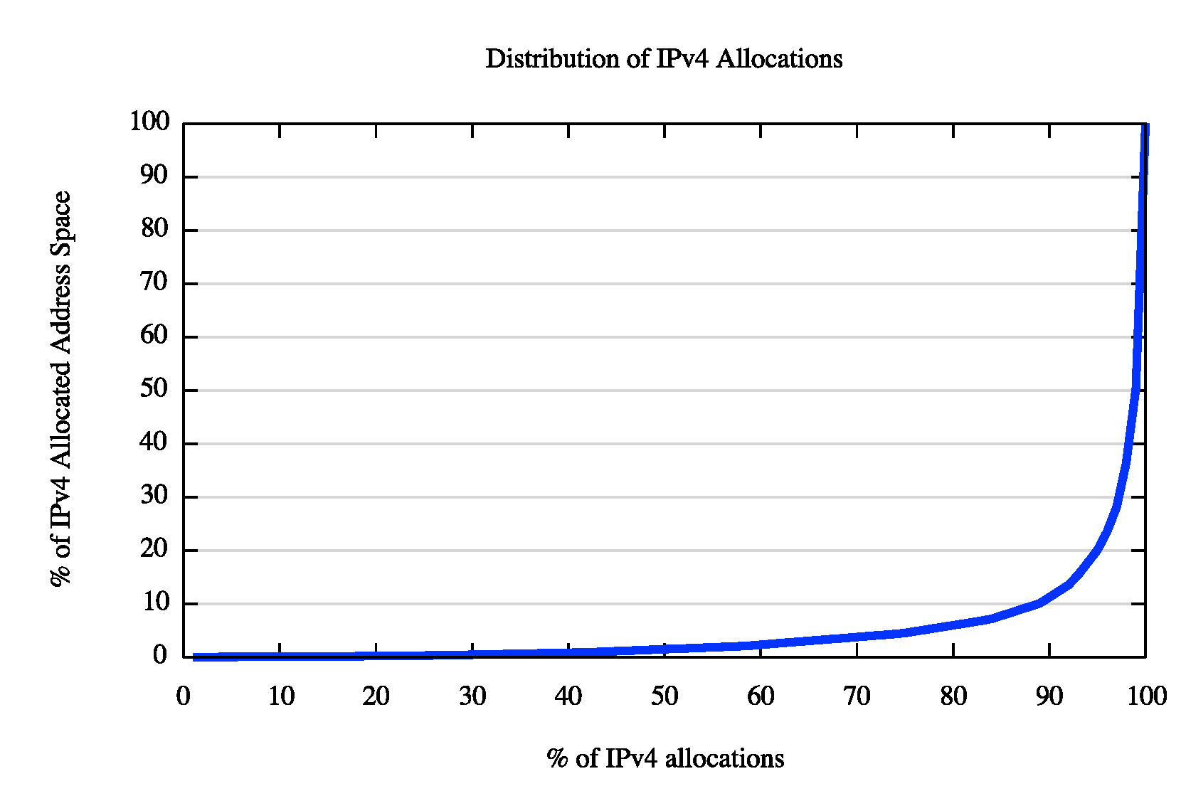 Another way to look at the address distribution is in terms of "skew". If the Internet is populated by a largely homogenous population then the distribution of address allocations would be relatively uniform, such that the group of largest allocations would not be vastly larger than the group of smallest allocations. One way to look at the level of skew is to use a cumulative distribution plot, comparing the number of allocations to the amount of address space, shown below.