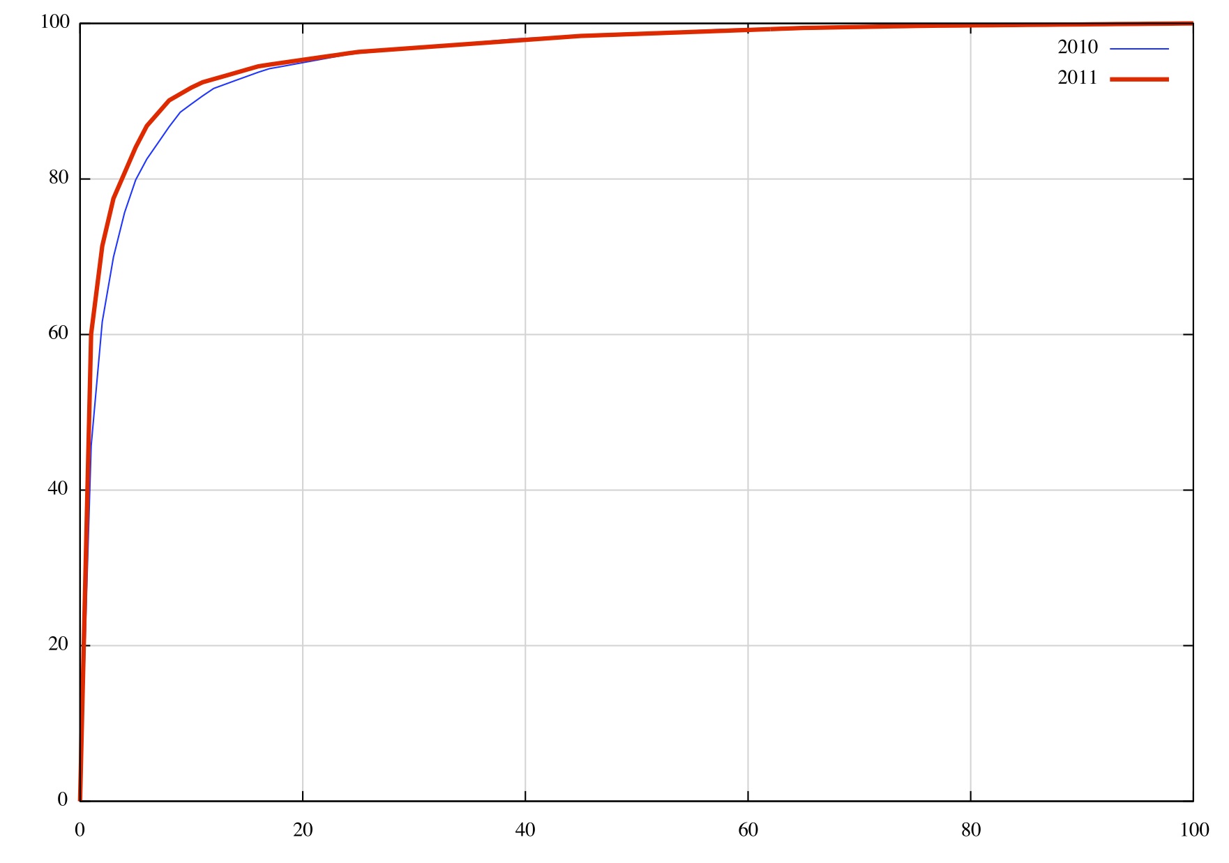 Compared to 2010 the concentration of address allocations to a small number of providers has increased in relative terms. In 2011
