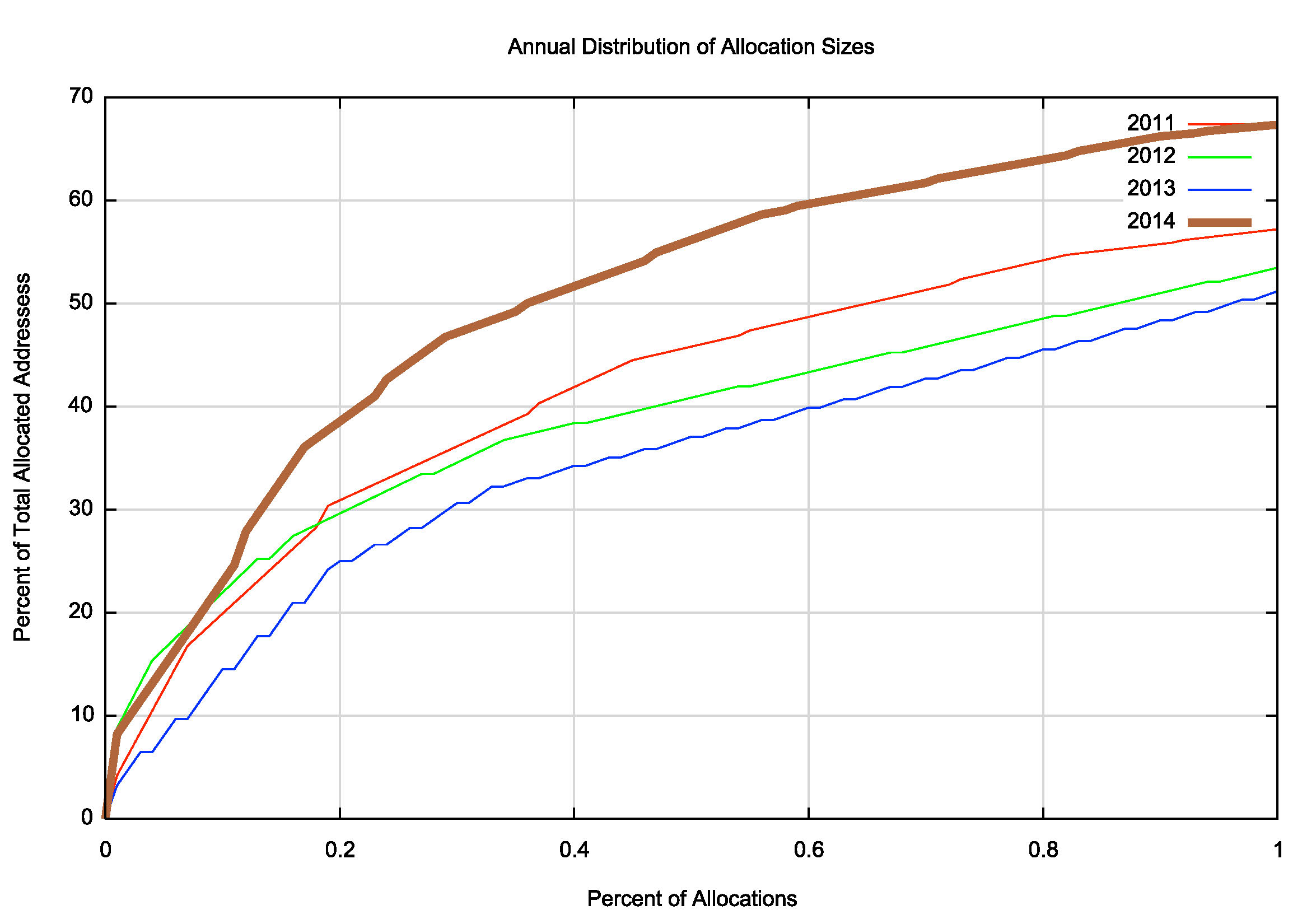 Figure 1 shows the address distribution for the years 2011 through to 2014. The shift over this period shows a relatively steady level in the proportion of address space being allocated to the larger providers. The largest 10% of allocations in 2011 received, 91.1% of the total allocated address space, which fell to 87.0% in 2012, and rose to 88.5% in 2013, and was at 85.3% in 2014. In 2011 one half of all addresses were allocated to 70 entities, while in 2012 80 entities consumed one half of all addresses, and in 2013 68 entities. In 2014 one half of the assigned address space was assigned to 39 entities (Figure 2).