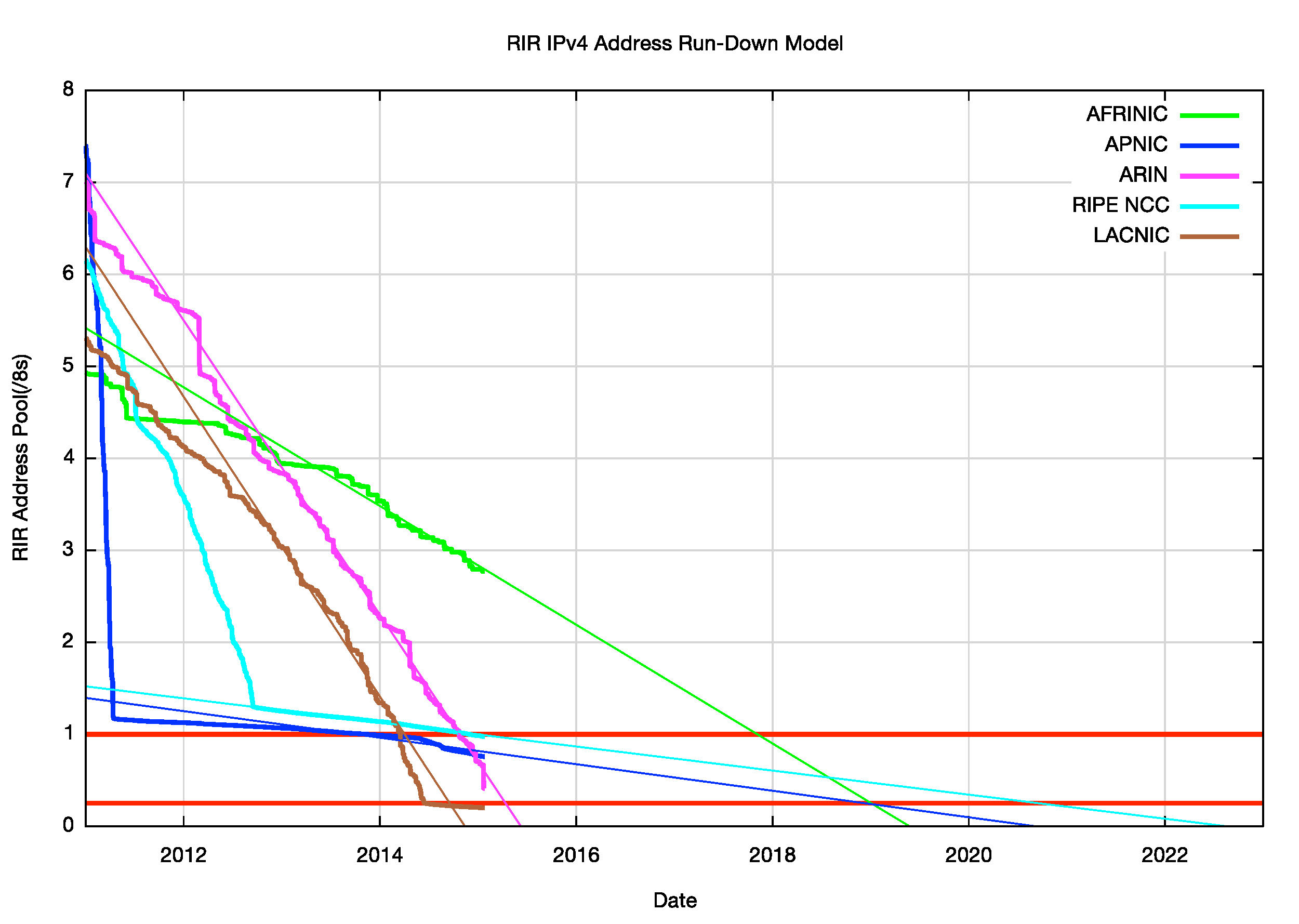 The Internet continues to rely very heavily on IPv4, and the consumption of a further 64 million addresses in 2014 leaves 86 million addresses in the pool of unallocated addresses, or a total of some 16 months if we were able to access these addresses at the same rate as we have been to date. However this is not going to be the case.