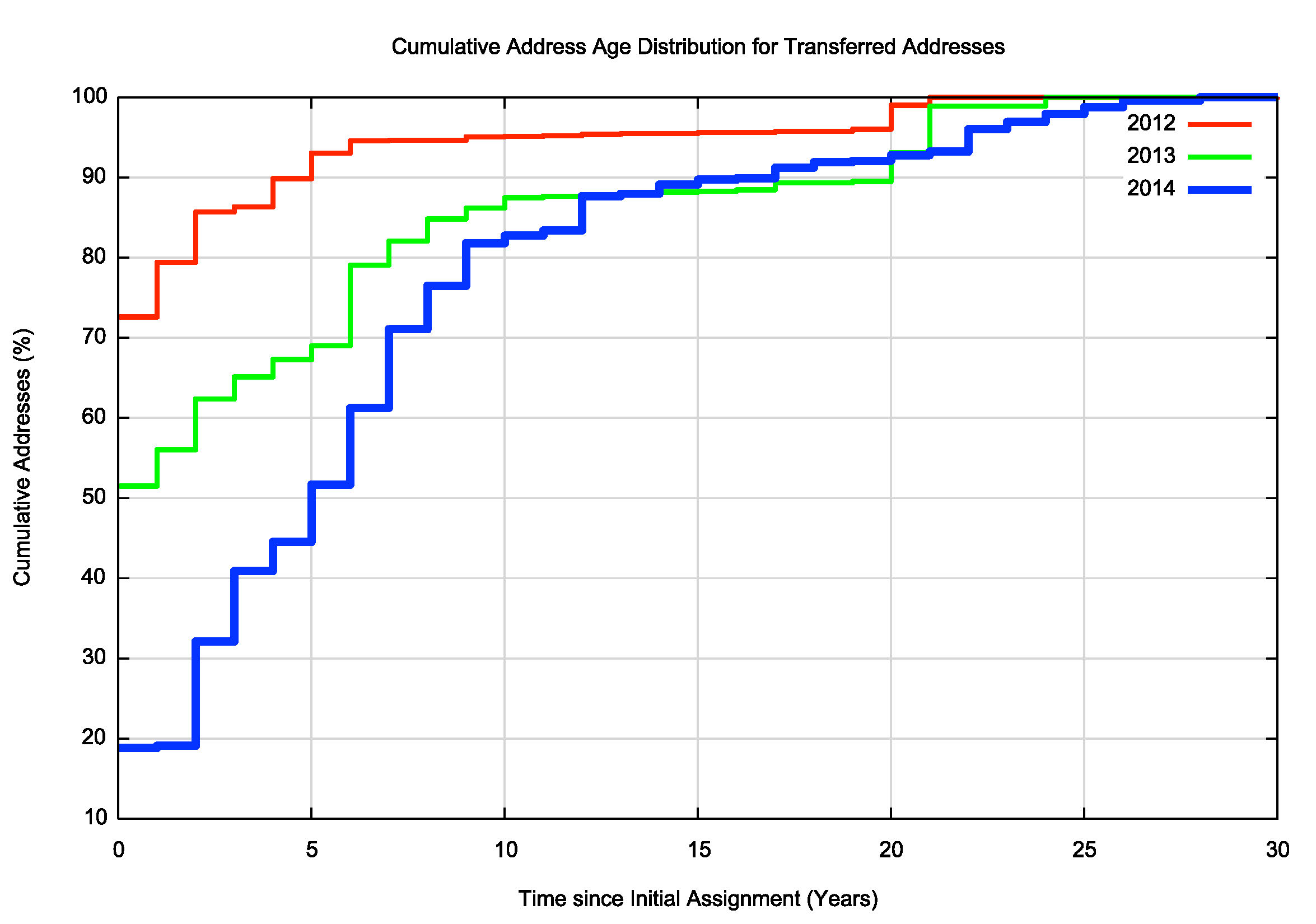 How “old” are these transferred addresses? Is the address transfer market reaching back into the early so-called “legacy” allocations and assignments and reviving otherwise unused addresses and put them back into current use? A look at the relative age distribution of registered address transfers shows that the market has had some success in this area, and in 2014 one half of the addresses transferred in this manner were initially registered in 2009 or earlier (i.e. were initially registered 5 or more years previously) but the bulk of the addresses transferred were initially registered within the last 10 years (Figure 4). So the data appears to indicate that the address transfer market is reaching back further into the older records for unused addresses over time.