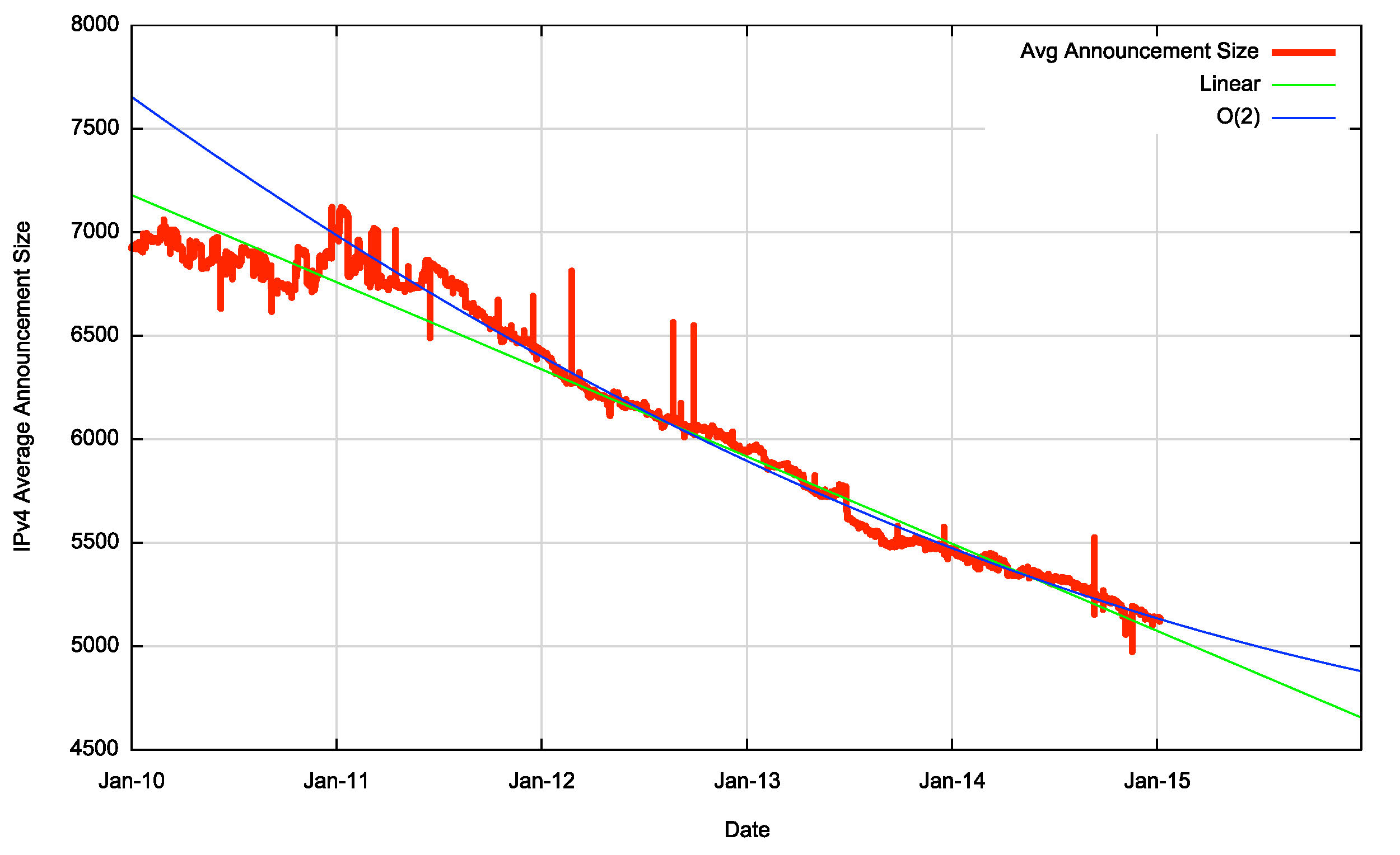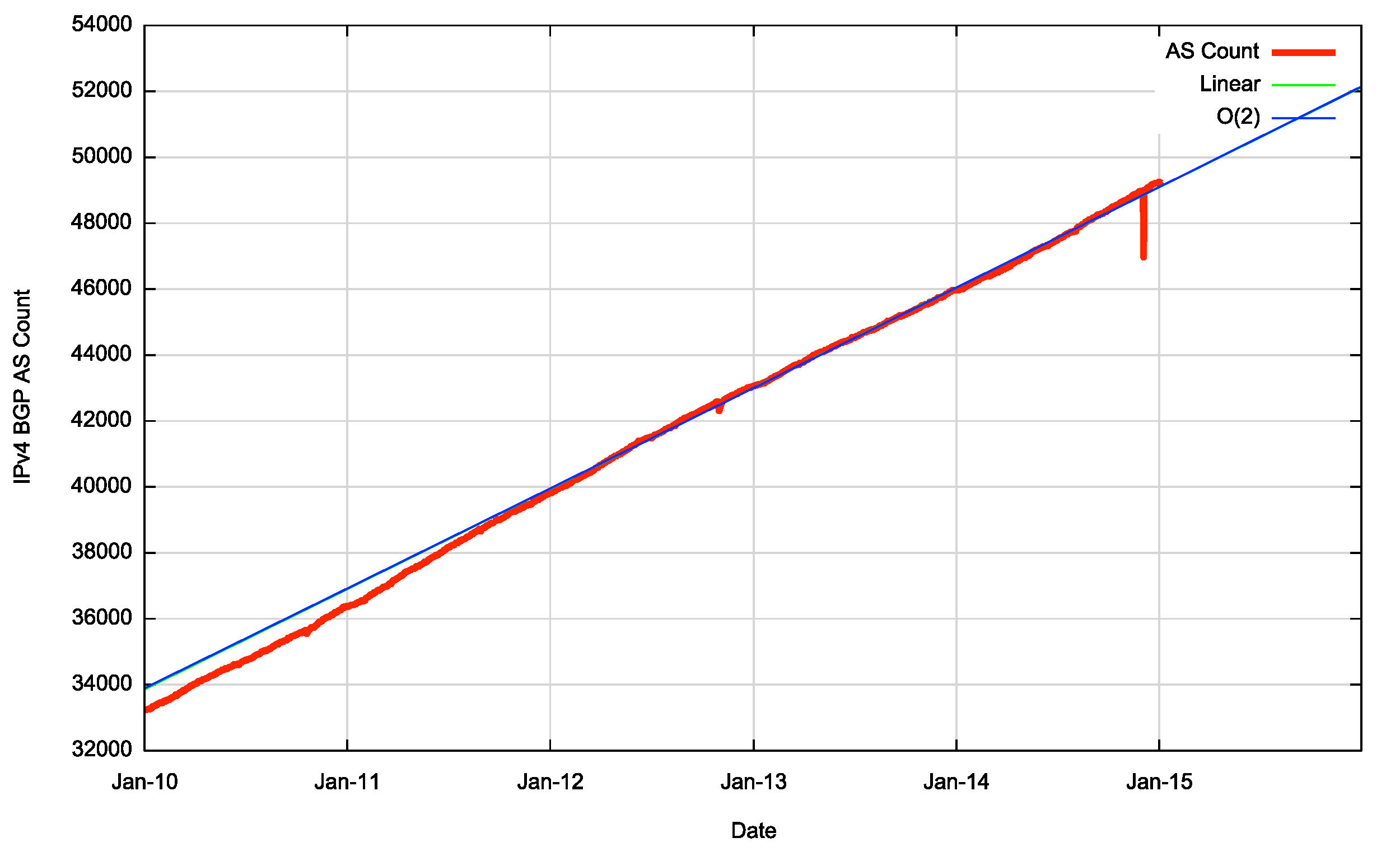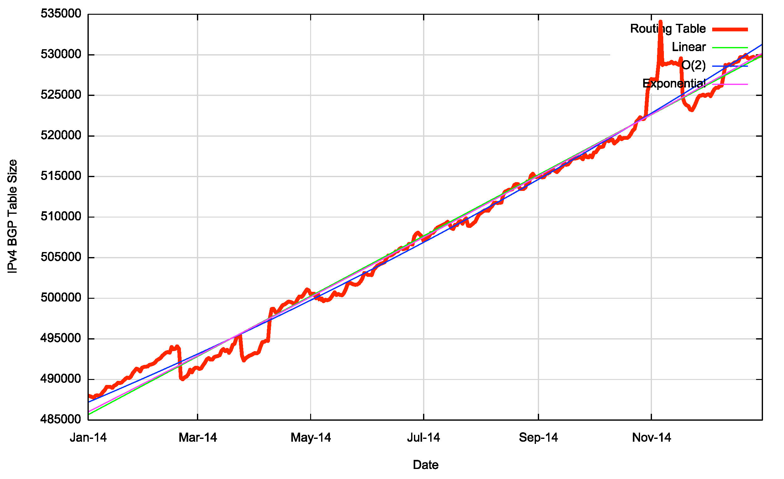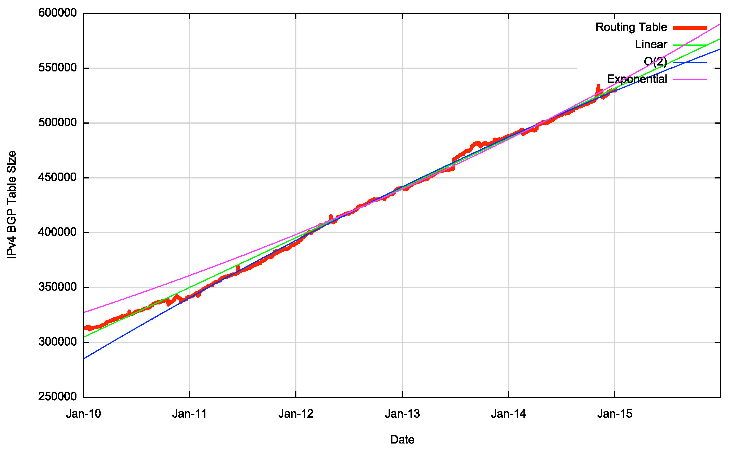 The first order differential, or the rate of growth, of the BGP routing table is shown in Figure 18. The rate of growth of the routing table appears to be increasing in the period 2009 to 2012. With the exception of the mid-2013 deaggregation event, the table growth in 2013 is at much the same level as 2012. The 2014 growth rate varied between 100 and 150 additional entries per day, which is consistent with the range of growth in the previous two years. From 2011 to the end of 2014 the average daily growth in the Ipv4 routing table has dropped from some 145 new entries per day to the current rate of some 130 new entries per day. If the first order differential matches a flat line, then the data set matches a linear slope. The data shows a slowly declining rate of growth, which is more consistent with a linear growth model than one of compound growth. The consequent predictions of IPv4 BGP table size using this constant growth model are shown in Table 3.