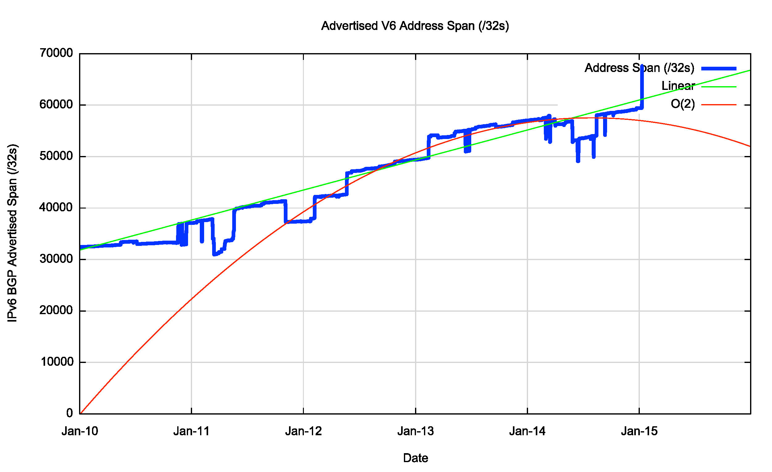 This implies that a linear growth model is inappropriate for modelling growth in IPv6. A better fit to the data is a compound growth model, with a doubling factor of some 22 months. It is possible to fit a linear model to the first order differential of the data, which can be used to derive an O(2) polynomial fit to the original data. The fit of a linear, O(2) polynomial and an exponential model against the data is also shown in Figure 20.