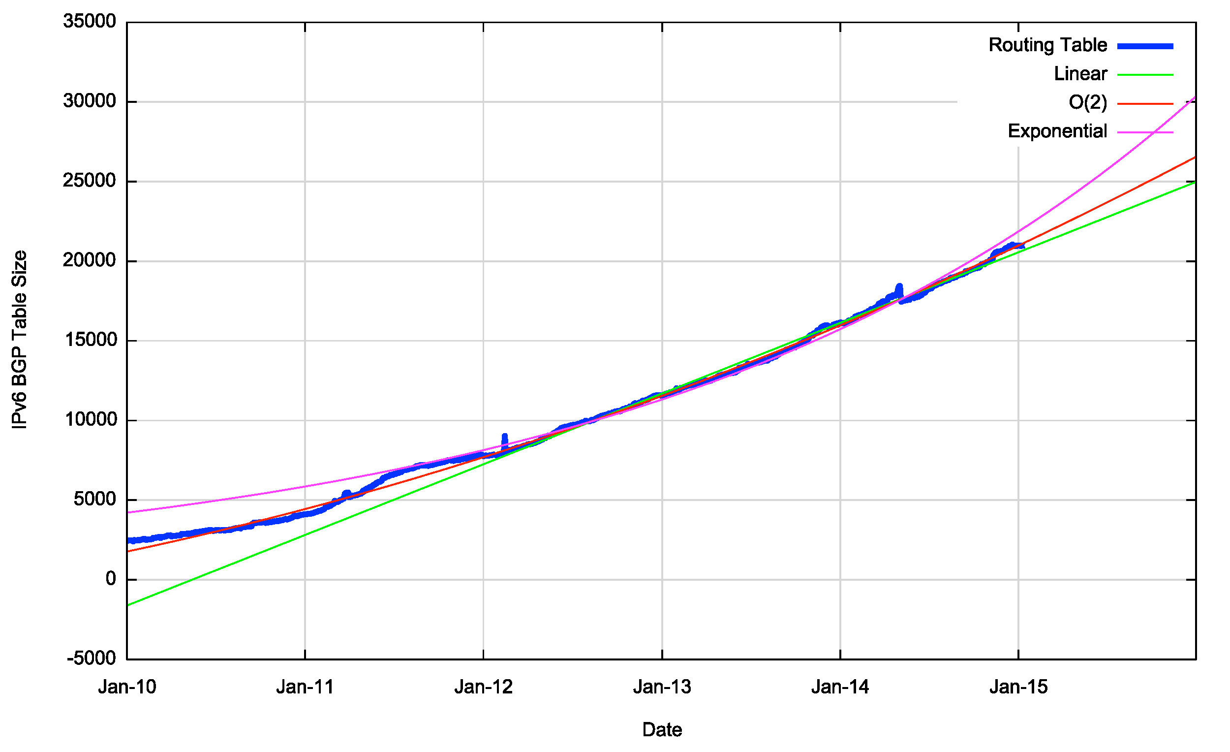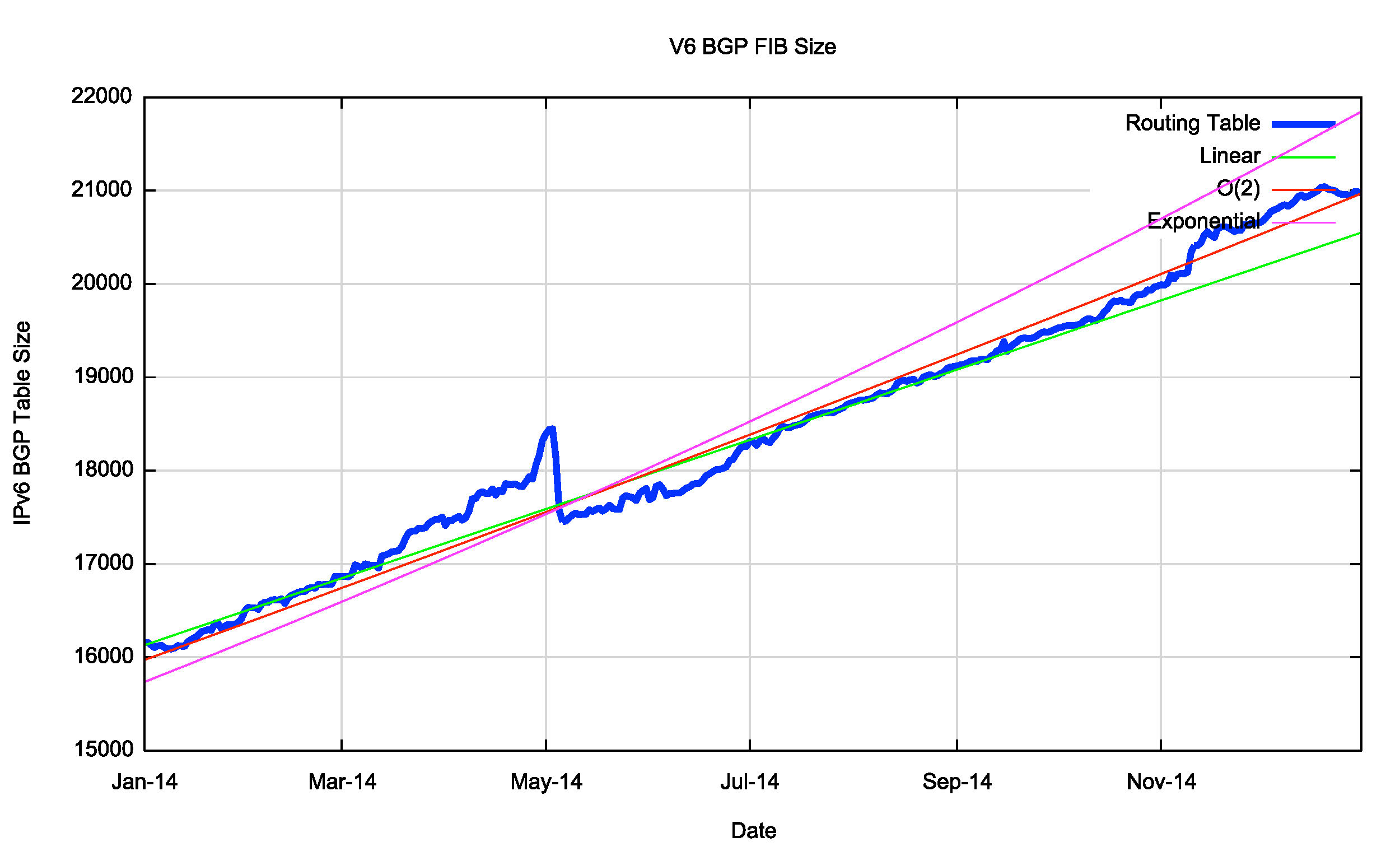 Figure 15 – IPv6 BGP Table in 2014, as seen by peers of Route Views