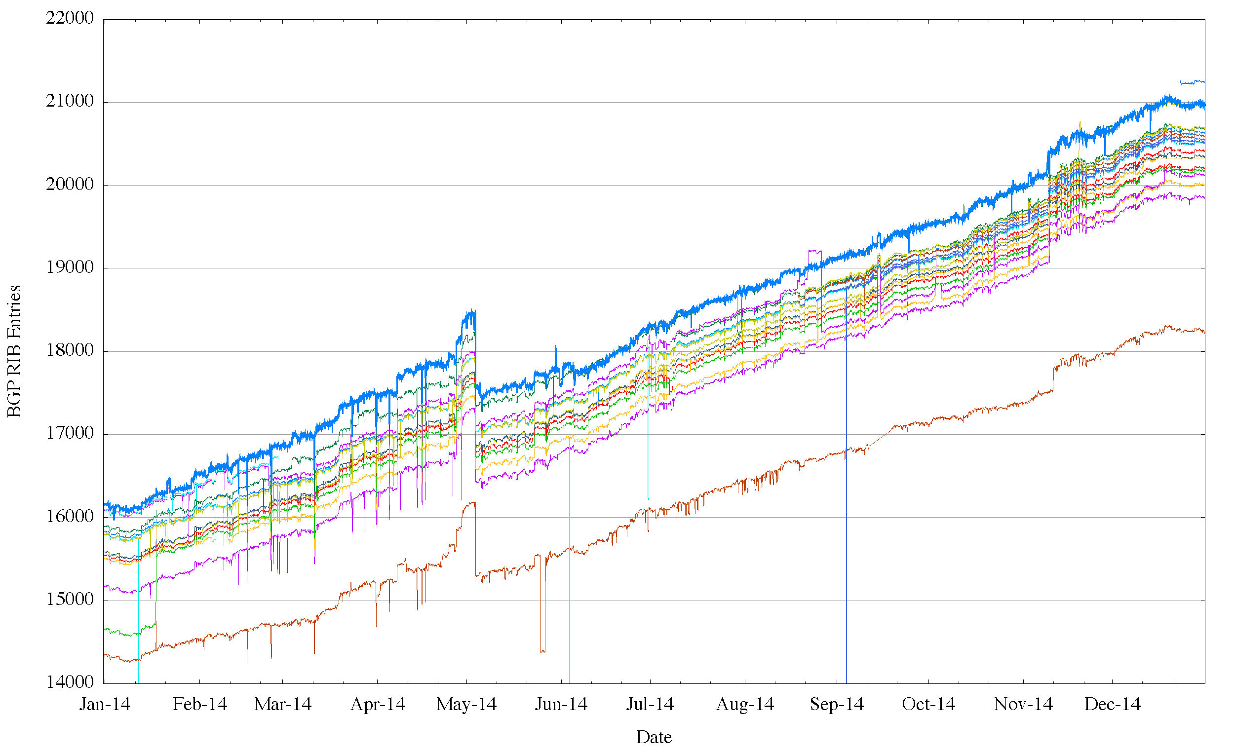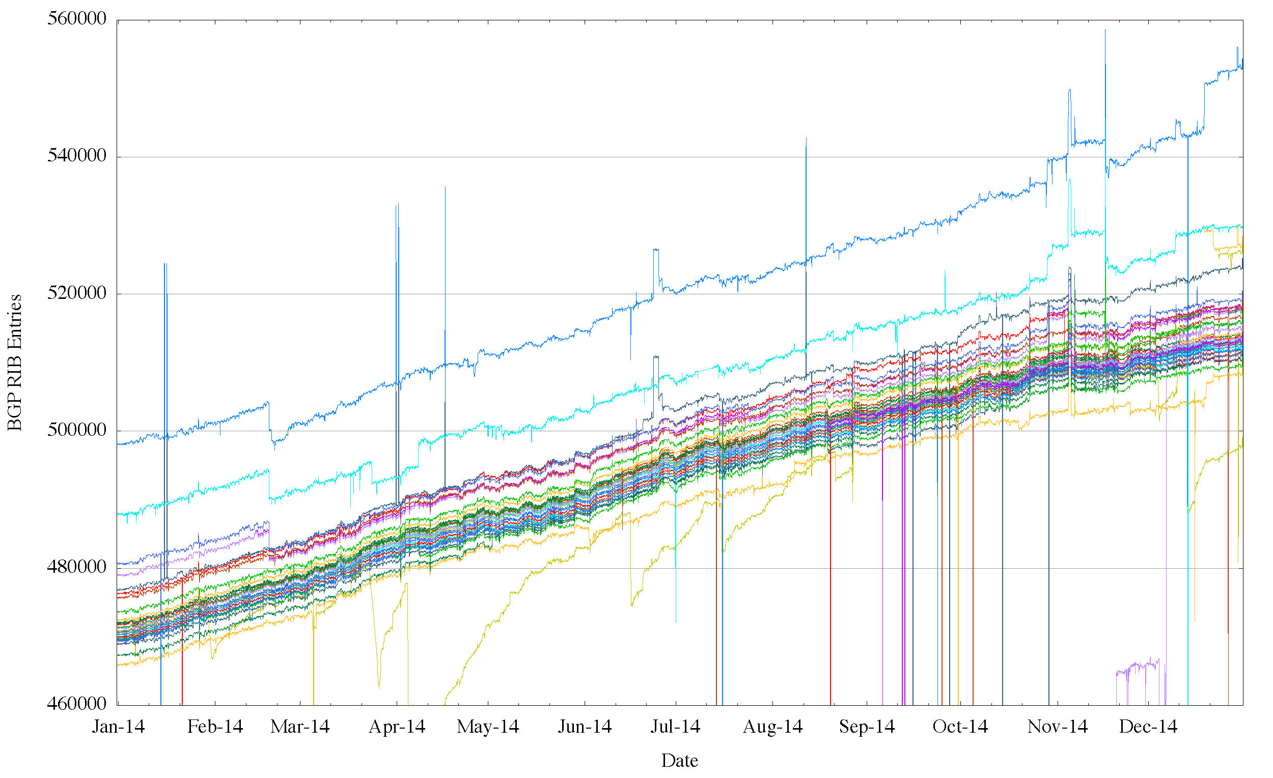 (each line tracks the daily size of an individual routing peer of the Route Views collector)
