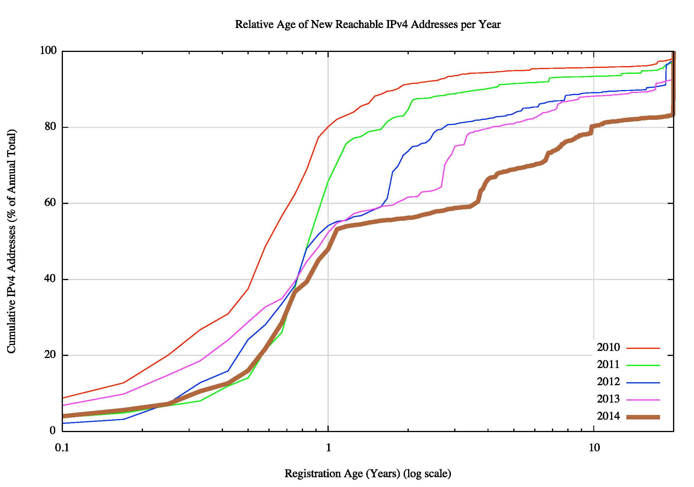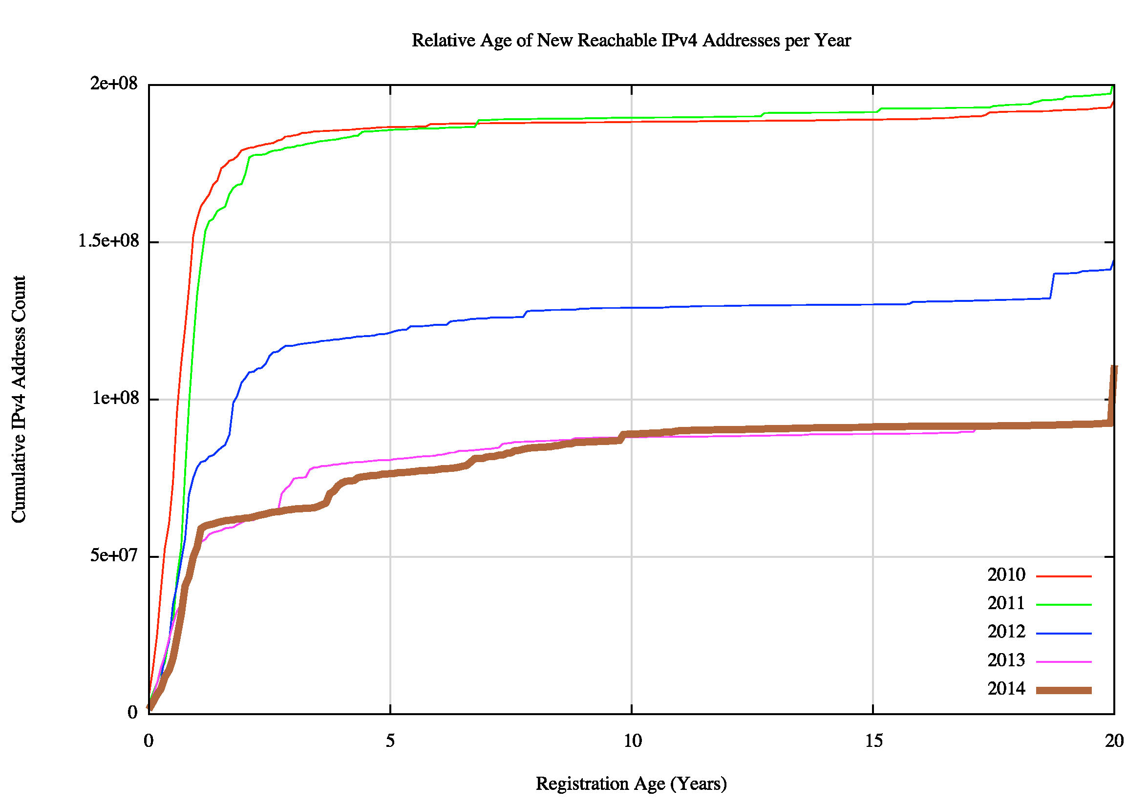 Figure 19 shows the relative age (as determined by the date of registration of the address) for addresses that were advertised each year since 2010. The effects of IPv4 address exhaustion are now clearly visible in that the amount of advertised addresses per year has dropped from just below 200 million addresses per year in 2010 and 2011, to around 100 million addresses in 2013 and 2014.