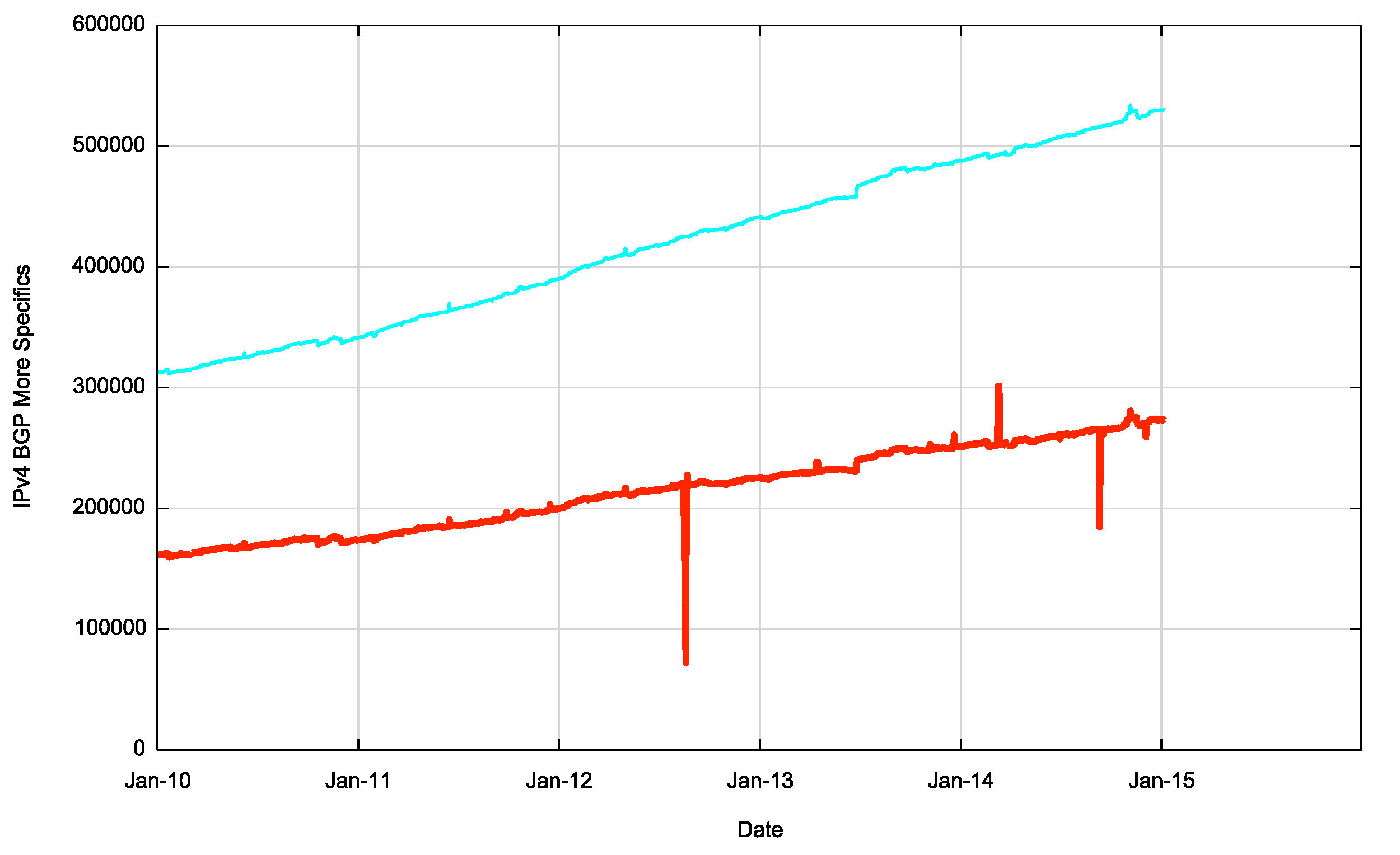 The following figures show some of the vital statistics for IPv4 in BGP since the start of 2010 to the end of 2014.