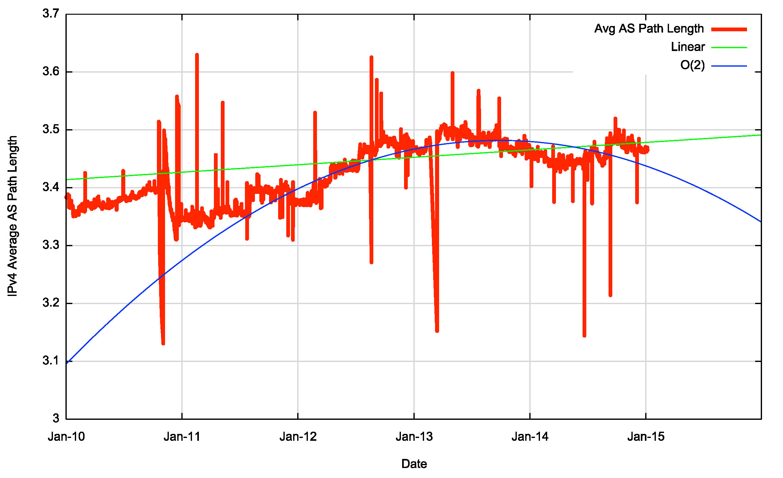 Over this period from January 2011 to December 2014 we had the exhaustion of the IPv4 address space pools in APNIC in April 2011 (serving the Asia Pacific region), in the RIPE NCC in September 2012 (serving Europe and the Middle East) and in LACNIC (serving Latin America and the Caribbean) in May 2014. The four year period since the start of 2011 has seen the span of addresses advertised in the routing system slowing down (Figure 5). However, at the same time there has been a consistent level of growth in the number of entries in the routing table over the 2011 – 2014 period. The result of these two factors is that the average announcement in the IPv4 routing table is spanning fewer addresses, or, to put it another way, the granularity of the IPv4 routing space is getting finer. As Figure 4 shows, the average BGP announcement size has dropped from 7,000 host addresses at the start of 2010 to 5,100 addresses at the end of 2014. While /24 announcements are steady at a little over 50%, the relative number of /22 announcements is increasing, while the relative number of larger announcements, including up to /21s are decreasing. The topology of the network has remained relatively consistent, with the growth in the Internet being seen as increasing density of interconnectivity, rather than through extending transit paths, so the average AS path length has remained relatively constant, between 3.3 and 3.5 for this period (Figure 6).