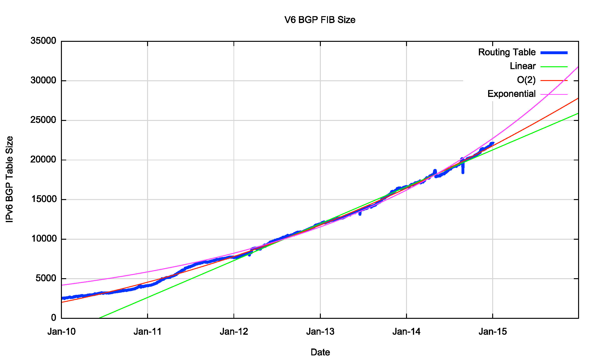 The exponential and polynomial projections in Table 4 provide a reasonable estimate of the high and low bounds of the growth of the IPv6 BGP routing table in the coming years. It should be noted that while the high bound of this growth curve tends to a growth profile that is close to the parameters of Moore’s Law, with a doubling interval of some 26 months, the mitigating factor is that these numbers are not exactly massive numbers, and in five years time we would be expecting a IPv4 BGP table size of 760,000 entries, or some 6 times the size of the higher bound of expectations for the IPv6 routing table in the same period. These numbers are still comfortably within current router hardware technologies.