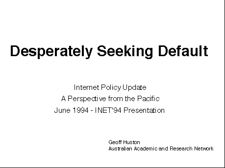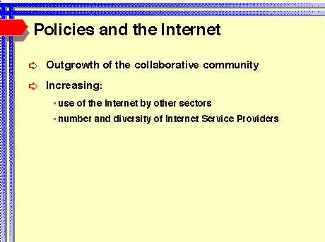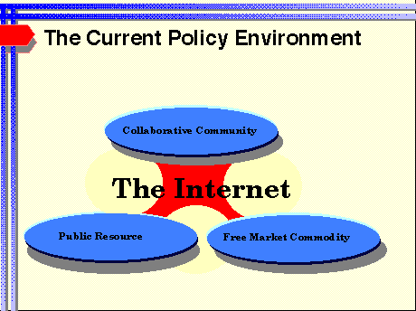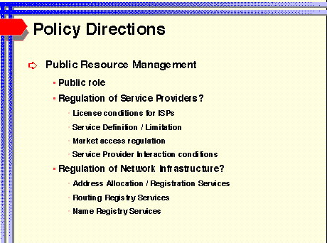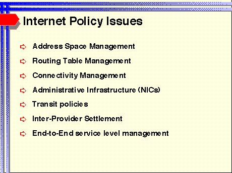 This presentation is not intended to enumerate to any level of detail the various national or regional policy-based environments within which the Internet operates - either within the Pacific region or globally. Nor is it intended to describe the current state or likely developments of specific Internet service programs. Instead this presentation is intended to illustrate the nature of the Internet in terms of policy domains, and illustrate the various pressures which are driving change within the policy environment, and attempt to draw some conclusions from these observations in terms of appropriate policy measures for the further development of the Internet.