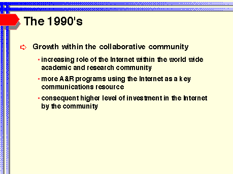 - Growth within the collaborative community increasing role of the Internet within the world wide academic and research community more A&R programs using the Internet as a key communications resource consequent higher level of investment in the Internet by the community
