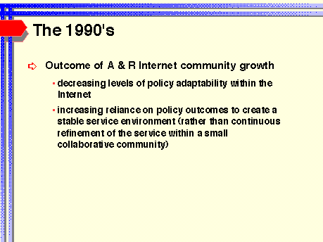 - Outcome of A & R Internet community growth decreasing levels of policy adaptability within the Internet increasing reliance on policy outcomes to create a stable service environment (rather than continuous refinement of the service within a small collaborative community)
