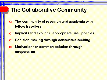 - The community of research and academia with fellow travellers - Implicit (and explicit) "appropriate use" policies - Decision making through consensus seeking - Motivation for common solution through cooperation