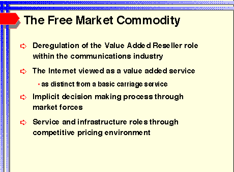 - Deregulation of the Value Added Reseller role within the communications industry - The Internet viewed as a value added service as distinct from a basic carriage service - Implicit decision making process through market forces - Service and infrastructure roles through competitive pricing environment