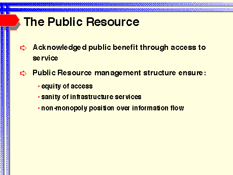 - Acknowledged public benefit through access to service - Public Resource management structures to ensure: equity of access sanity of infrastructure services non-monopoly position over information flow