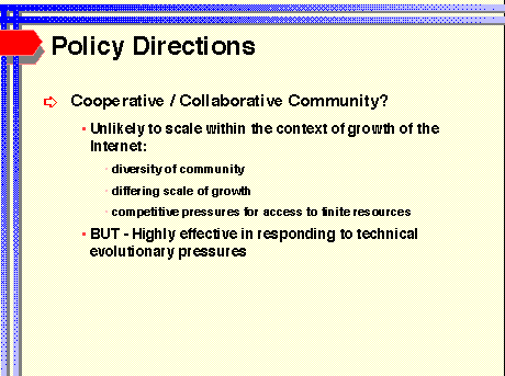 - Cooperative / Collaborative Community? Unlikely to scale within the context of growth of the Internet: diversity of community differing scale of growth competitive pressures for access to finite resources BUT - Highly effective in responding to technical evolutionary pressures