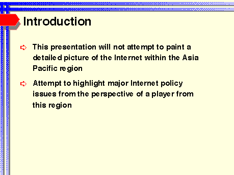 - This presentation will not attempt to paint a detailed picture of the Internet within the Asia Pacific region - Attempt to highlight major Internet policy issues from the perspective of a player from this region