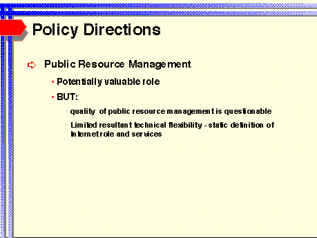 - Public Resource Management Potentially valuable role BUT: Quality of public resource management is questionable Limited resultant technical flexibility - static definition of Internet role and services