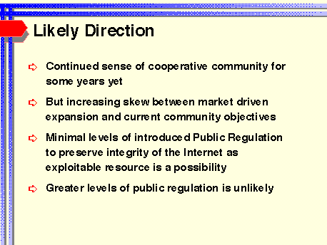 - Continued sense of cooperative community for some years yet - But increasing skew between market driven expansion and current community objectives - Minimal levels of introduced Public Regulation to preserve integrity of the Internet as exploitable resource is a possibility - Greater levels of public regulation is unlikely