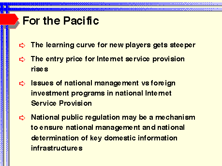 - The learning curve for new players gets steeper - The entry price for Internet service provision rises - Issues of national management vs foreign investment programs in national Internet Service Provision - National public regulation may be a mechanism to ensure national management and national determination of key domestic information infrastructures