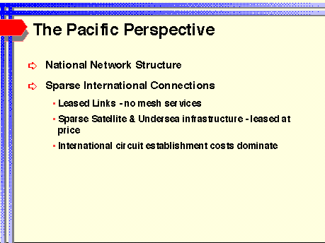 From an Internet perspective this region is not one which inherently possesses any strong regional bindings as a basis for common effort. The communication tariff structure within the region is a typical example of lack of such regional binding, where the tariffs in place effectively values inter-regional infrastructure at the same level as intercontinental infrastructure. In addition the economies of many countries in the region are only developing strongly in recent years, and the conservative nature of the international cable and satellite deployment activities where deployment has traditionally occurred long after adequate demand has been identified, has resulted in a situation where international data services for many countries in the region are priced at levels which reflect a limited supply under heavy competitive pressure.