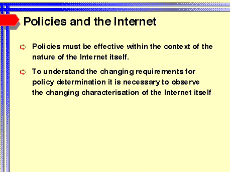 - Policies must be effective within the context of the Internet itself - To understand the changing requirements for policy determination it is first necessary to observe the changing characterisation of the Internet