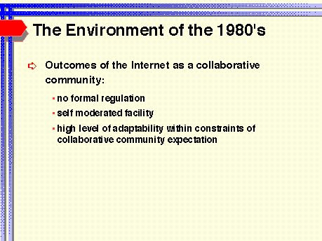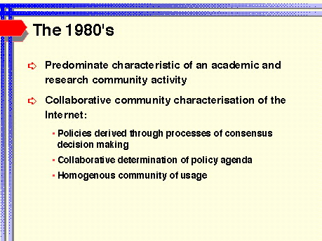 Through the 1980's the Internet, as a collection of service providers, consumers, developers and researchers was a largely homogenous environment, and appeared to bear all the appropriate hallmarks of a collaborative community characterisation, including aspects of common policies, derived through a process of consensus seeking, and a common forward policy agenda strongly concerned with technological refinement, also derived in a collaborative manner. The common nature of the various participatory partners and their shared objective effectively ensured that a consensus seeking collaborative policy determination process would indeed terminate quickly with readily acceptable outcomes.