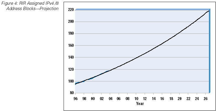 It is worth a slight digression into the method of projection being used here. The technique is one of using a best fit of an exponential growth curve to the data. The underlying assumption behind such a projection is that the growth rate of the data is proportional to the size of the data, rather than being a constant rate. In network terms, this assumes that the rate of consumption of unallocated addresses is a fixed proportion of the number of allocated addresses, or, in other words, the expansion rate of the network is a proportion of its size, rather than being a constant value. Such exponential growth models may not necessarily be the best fit to a network growth model, although the data since 1995 does indicate an underlying exponential growth pattern. Whether this growth model will continue into the future is an open issue.