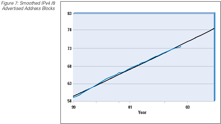This BGP data is based on an hourly inspection of the amount of address space advertised within the Internet routing table. The data collection commenced in late 1999, and the data gathered so far is shown in Figure 6. The problem with this data is that there is some considerable amount of fluctuation in the amount of address space advertised over time. The major step changes are due to a small number of /8 advertisements that periodically are announced and withdrawn in BGP. In order to obtain reasonable data for generating projections, some noise reduction on this data needs to be undertaken. The approach used has been to first filter the data using a constant value of 18 /8 prefix announcements, and then use a sliding average function to create a smoothed time series. This is indicated in Figure 7.