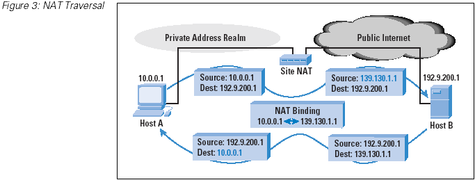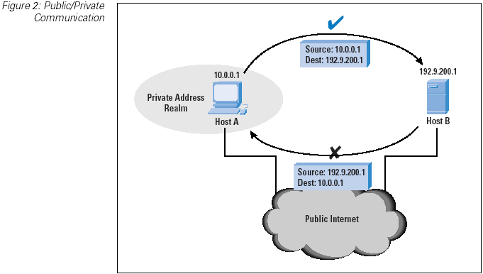As shown in Figure 2, how can local (private) host A initiate and maintain a TCP session with remote (public) host B? Host A first uses the Domain Name System (DNS) to find the public IP address for host B, and then creates an IP packet using host B's address as the destination address and host A's local address as the source, and passes the packet to the local network for delivery. If the packet was delivered to host B without any further alteration, then host B would be unable to respond. The public Internet does not (or should not at any rate!) carry private addresses, because they are not globally unique addresses.