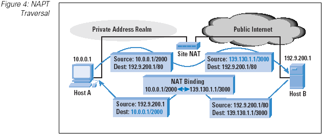A variant of the NAT is the Port-Translating NAT, or NAPT. This form of NAT is used in the context of TCP and User Datagram Protocol (UDP) sessions, where the NAT maps the local source address and source port number to a public source address and a public-side port number for outgoing packets. Incoming packets addressed to this public address and port pair are translated to the corresponding local address and port. Again, the binding is maintained by a NAT idle timer, and upon expiration of the timer the public address and port pair are returned to the NAT pool (Figure 4).