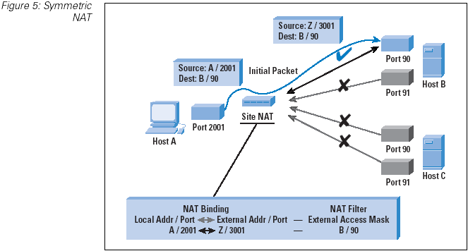 A symmetric binding is where the mapping of a local address to a public address is exclusively tied to the destination address used in the initial trigger outgoing packet for the lifetime of the binding. Incoming external packets with the mapped public address as their destination are translated to the local address only if the source address of the incoming packet matches the destination address of the original mapping. Multiple sessions to different public hosts may use the same mapped public address, or may use different public addresses for each session. This mapping is "endpoint" sensitive. Symmetric NATs represent a restricted model of operation, where each NAT binding represents a window through the NAT that is visible only to the destination host (Figure 5).