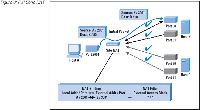 By comparison, a full-cone NAT allows any external host to use this opened window, where all incoming packets addressed to the mapped external address are translated to the mapped internal address and forwarded through the NAT. Symmetric NATs represent the most restrictive form of behavior, whereas full-cone NATs represent a far more permissive mode of operation.