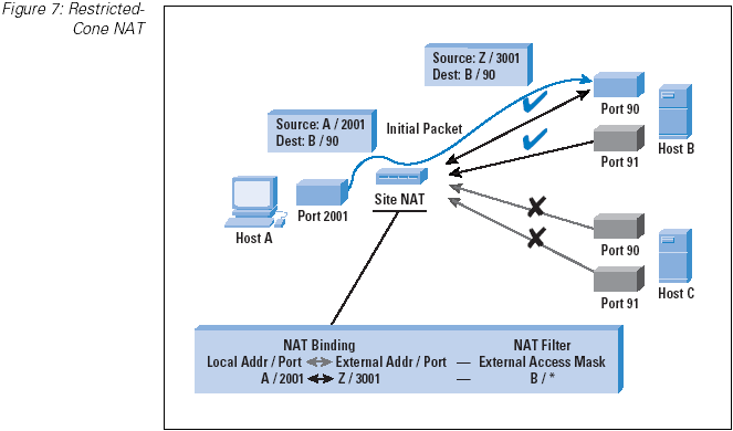 A restricted-cone NAT is one where the NAT binding is accessible only by the destination host,