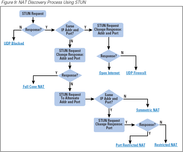 Periodic exchanges between the STUN client and server can also discover the timer used by the NAT to maintain address bindings. Additional components of STUN are intended to provide some reasonable level of integrity in the packet exchange. A flowchart of a STUN-based NAT discovery process is shown in Figure 9.