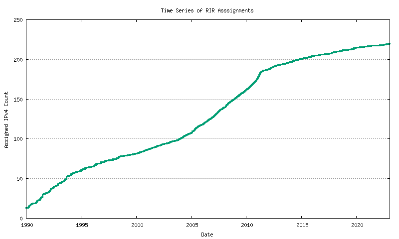 RIRs perform assignments of address blocks to ISPs and local Internet registries. The cumulative number of assigned addresses over time is shown in Figure 8.